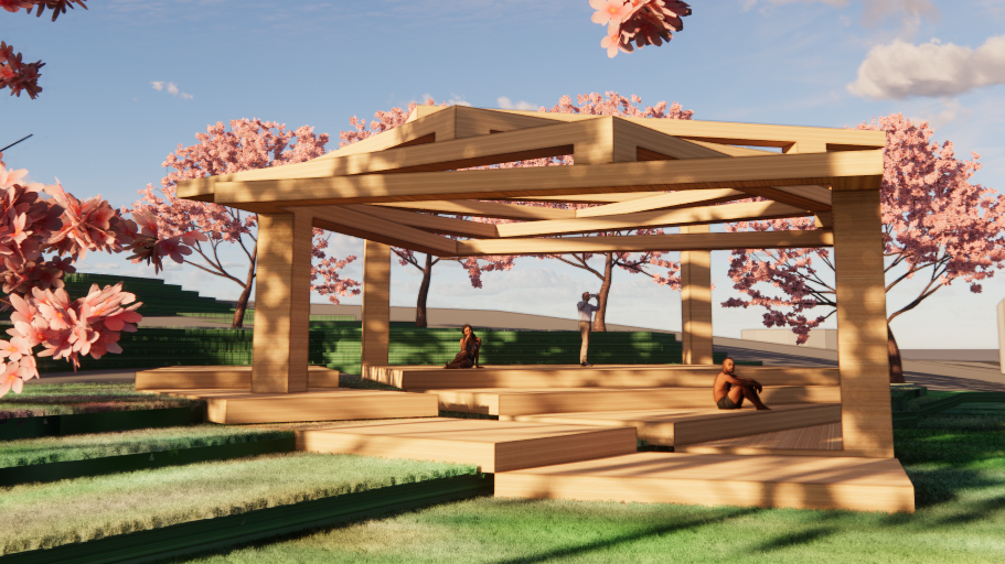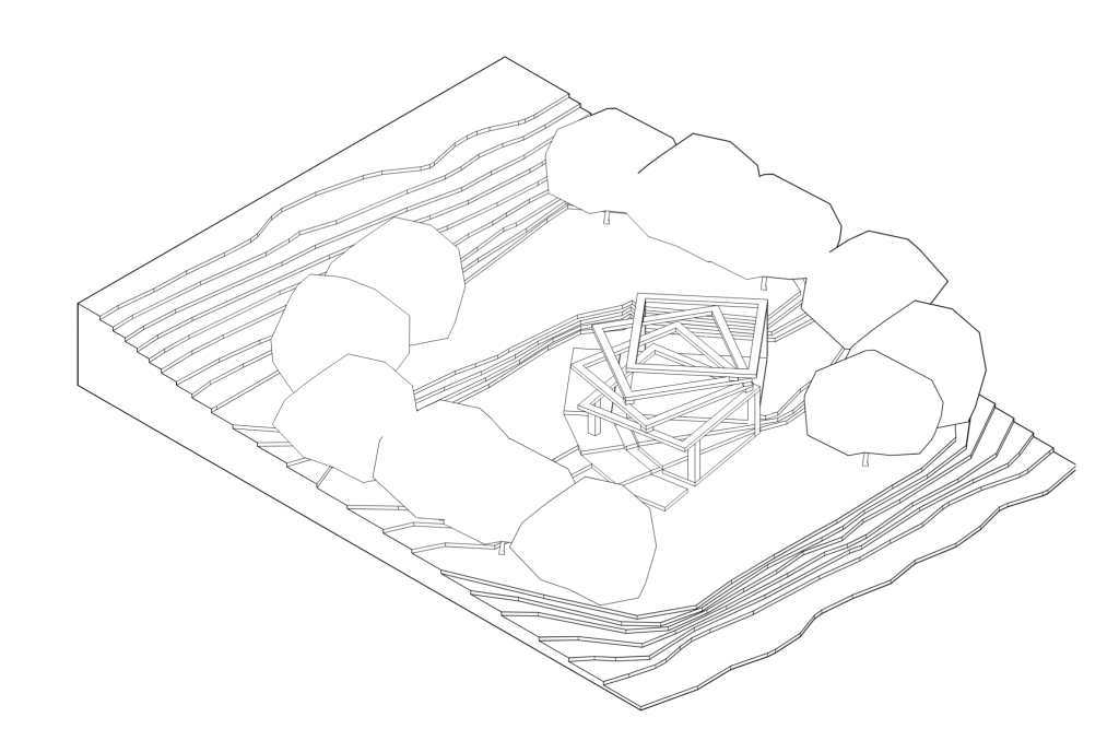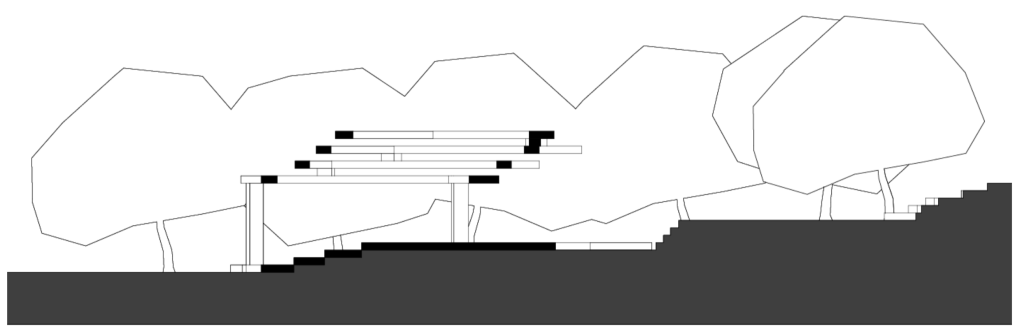 This viewing platform’s design was influenced by the surrounding environment. The goal was to blend in and be a part of the landscape. The stepping form of the structure is to better match the slope of the hill that this viewing platform resides on. Surrounding the viewing platform are cherry trees. The trees hearken back to when Ohill located on the Umass Amherst campus was once an orchid. The trees are placed in a way to create a framed view looking down the hill.